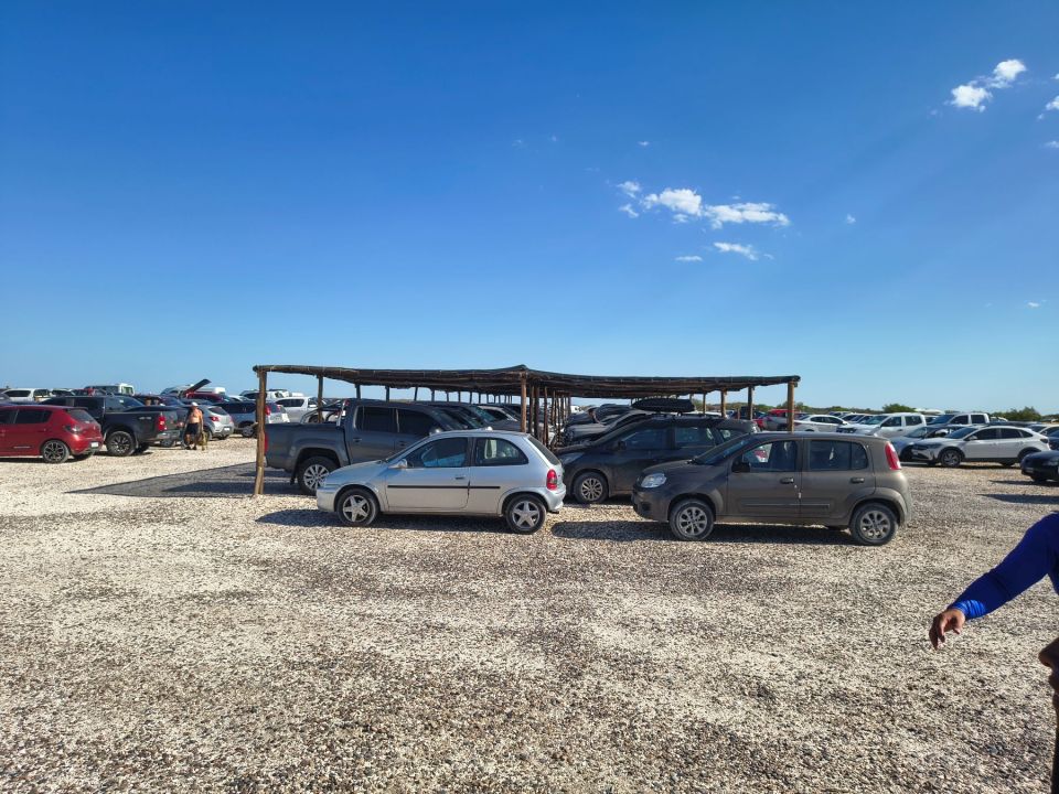 El estacionamiento es amplio. Los que llegaron temprano encuentran algo de sombra bajo los toldos; el resto queda a merced del sol. Hay que bajar rápido las cosas, sobre todo la sombrilla. El calor quema y el reflejo de los caracoles blancos no perdona: nadie quiere terminar rostizado antes del primer chapuzón.