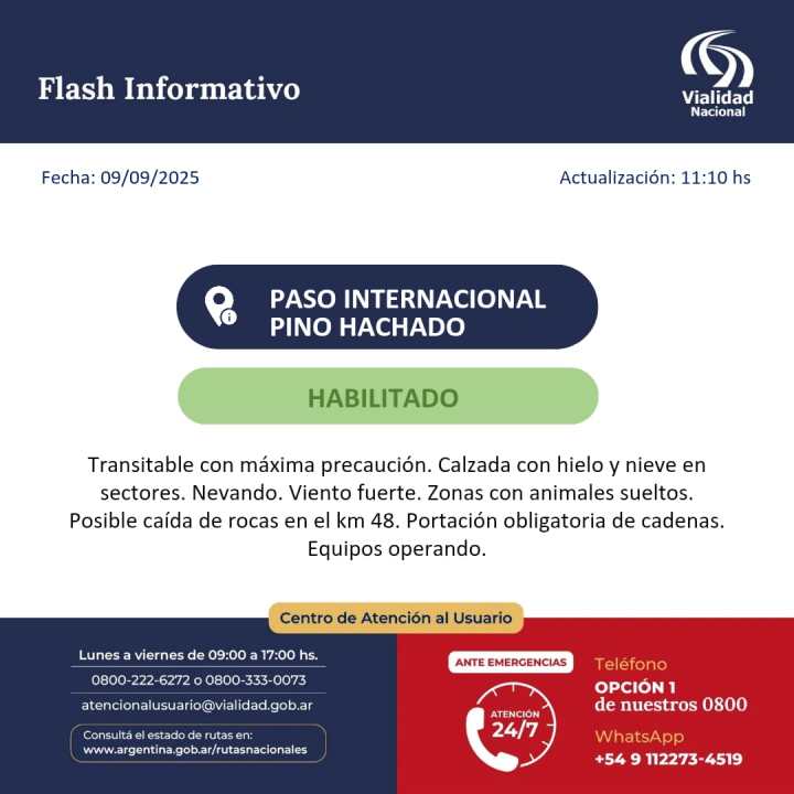Si bien se encuentra habilitado, se exige la portación obligatoria de cadenas y se recomienda transitar con máxima precaución.