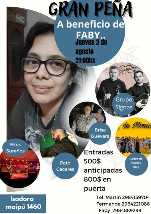En este sentido comunicó que la «Gran Peña a beneficio de Faby» tiene fecha para el jueves 3 agosto a las 21 en el bar Isadora ubicado en la calle Maipú al 1460 de la localidad de Roca. El evento tendrá un costo mínimo con entradas anticipadas a $500 y en puerta a $800.