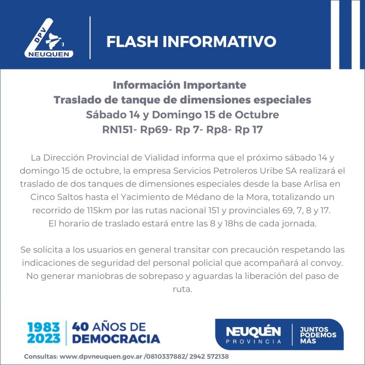 Por el traslado de dos tanques de grandes dimensiones, la Dirección Provincial de Vialidad de Neuquén solicitó a los automovilistas precaución a la hora de transitar por las principales rutas de Vaca Muerta este fin de semana extra largo.