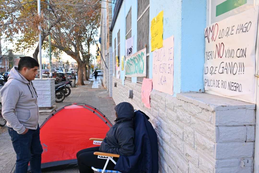 En Cipolletti, ayer por la tarde familiares de policías se sumaron al acampe fuera de la Regional Quinta exigiendo salarios dignos para los efectivos rionegrinos. Llegaron con parrillas, carpas y reposeras para pasar la noche, esperando respuestas.