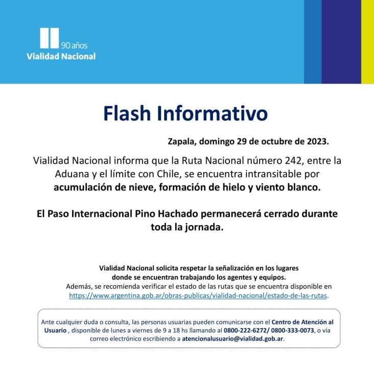 Al igual que ayer, el paso fronterizo que se encuentra en la Ruta nacional 242 se encuentra intransitable por acumulación de nieve, viento blanco y formación de hielo. El organismo nacional advirtió que se encontrará cerrado durante toda la jornada.