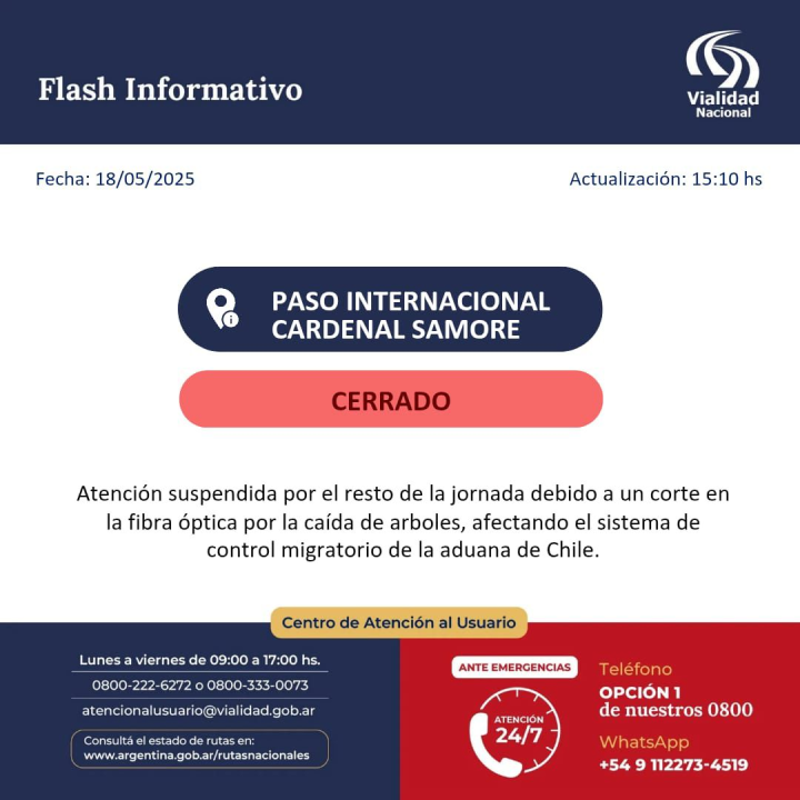 En el parte de las 15, las autoridades informaron que la atención en el paso Cardenal Samoré que conecta Neuquén con Chile, permanecerá suspendida «por el resto de la jornada» debido a un corte en la fibra óptica provocado por la caída de árboles, lo que afectó el sistema de control migratorio en la aduana chilena.