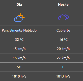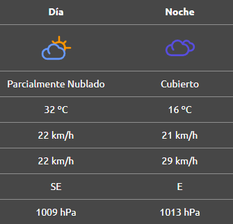 Por la noche, la mínima será de 16°C, mientras que el viento cambiará de dirección hacia el este, con ráfagas de casi 30 km/h.