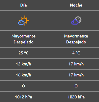 Por la noche la mínima será de casi 10°C, mientras que el viento cambiará de dirección hacia el noreste, con ráfagas de 30 km/h.