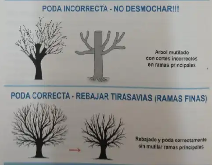 La especialista explicó que la poda es considerada incorrecta cuando el árbol es mutilado o “desmochado” en sus ramas principales afectando su crecimiento a futuro y acortando su expectativa de vida ya que un mal corte los puede debilitar. “Cuando se hacen intervenciones en el arbolado de manera incorrecta, se corre riesgo de que haya ramas que puedan romperse y que el árbol sea propenso a enfermedades”, indicó.