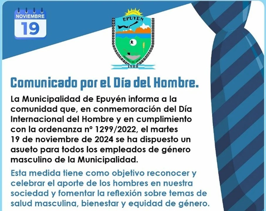 El próximo martes 19 de noviembre se celebra el «Día Internacional del Hombre» y el municipio de la localidad de Epuyén, provincia de Chubut, tomó una polémica decisión: anunciaron que los empleados del género masculino tendrán asueto. Esto generó rechazo a través de las redes sociales.