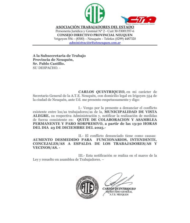 Desde ATE alertaron a la Subsecretaría de Trabajo que iban a iniciar medidas de fuerza por «aumento desmedido para funcionarios, intendente, concejales a espalda de los trabajadores y vecinos» de Vista Alegre.