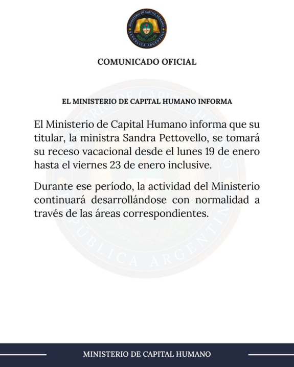Luego del cruce con la revista, desde el ministerio anunciaron que la titular Sandra Pettovello se tomará vacaciones desde el lunes 19 hasta el viernes 23 en un comunicado oficial.