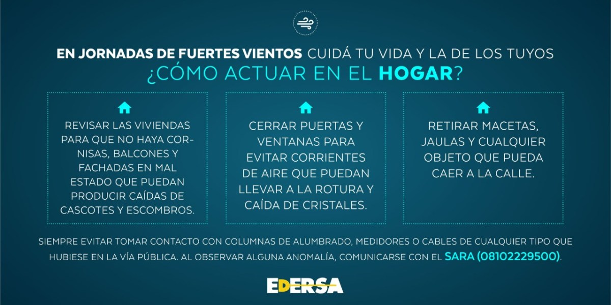 La responsable del servicio de energía eléctrica aconseja revisar fachadas o balcones que se encuentren en mal estado, así como macetas o jaulas que puedan caer sobre la calle. También es útil cerrar todo tipo de aberturas para que las corrientes de aire no ocasionen roturas de vidrios.