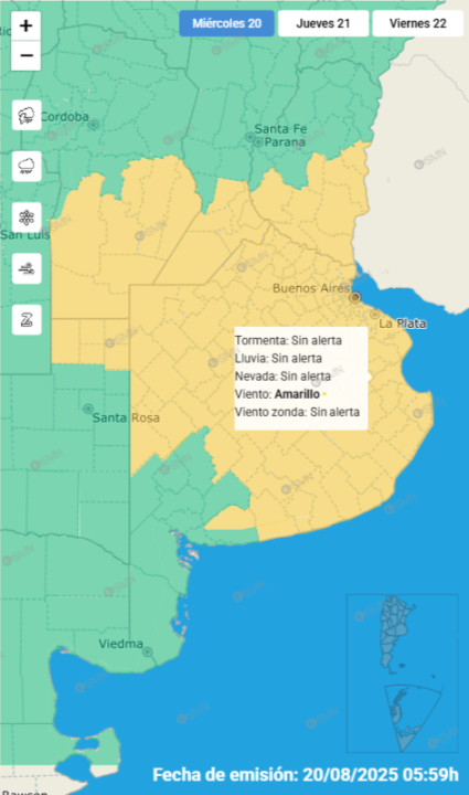 El Servicio Meteorológico Nacional emitió una advertencia. Las zonas afectadas y los peores horarios este 20 de agosto.