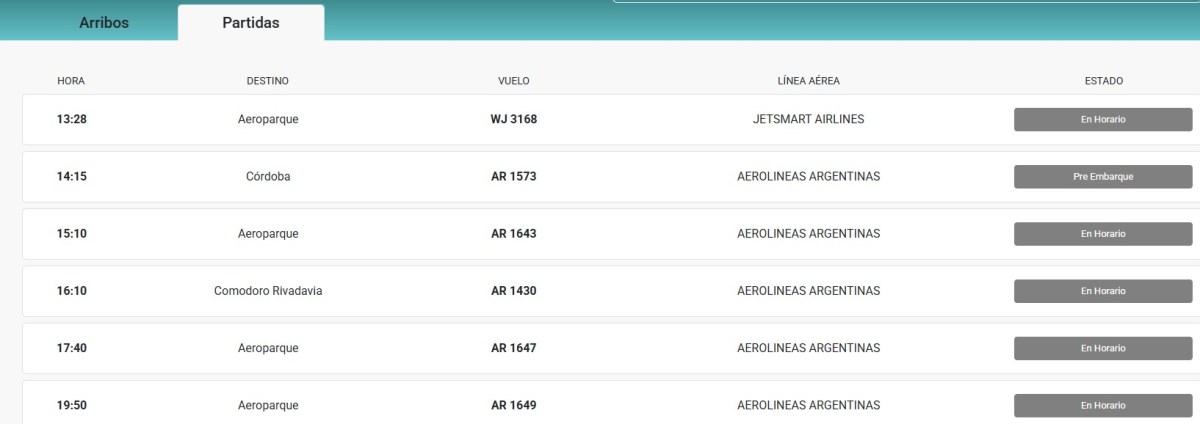 Por la tarde los vuelos de Aerolíneas Argentinas con salida a las 14:15, 15:10, y 16:10 estaban «en horario».