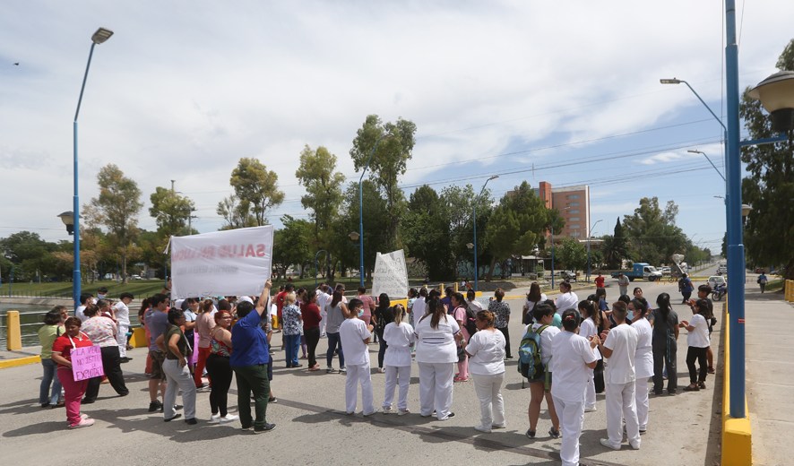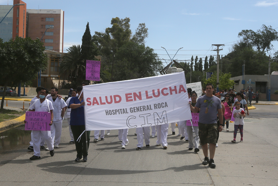La manifestación comenzó cerca de las 11 frente al Monumento al Personal de Salud, ubicado sobre la rotonda de calles Gelonch y Avenida Roca. Un buen número de miembros de diferentes sectores del nosocomio se sumaron a participar, en una causa que se presentó como «sin distinción gremial».
