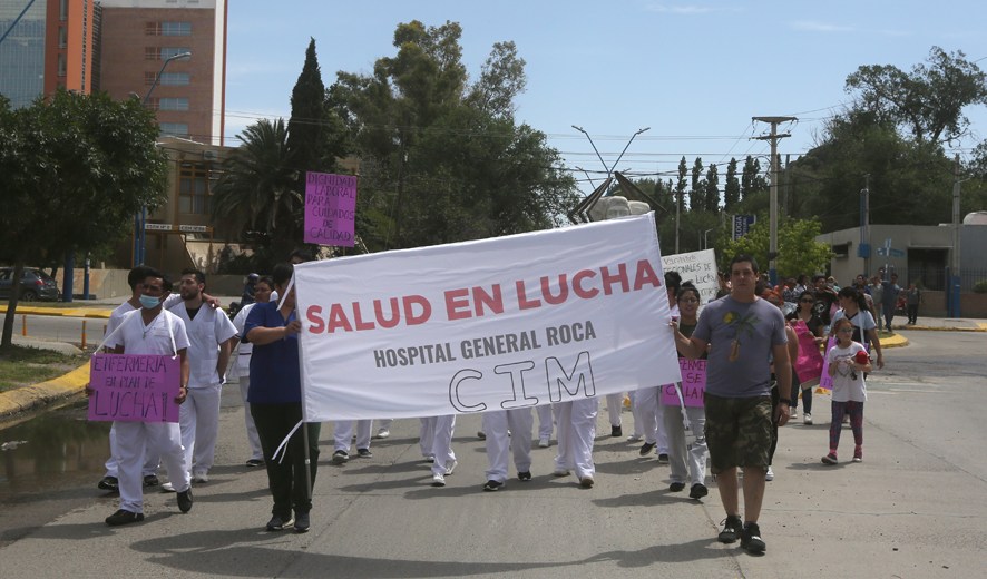 Una nuevo reclamo por parte de trabajadores de la Salud se hizo escuchar esta mañana en Roca. Más de un centenar de enfermeros del hospital local se congregaron para exigir un aumento en el pago de las horas extras y mejoras de las condiciones laborales.