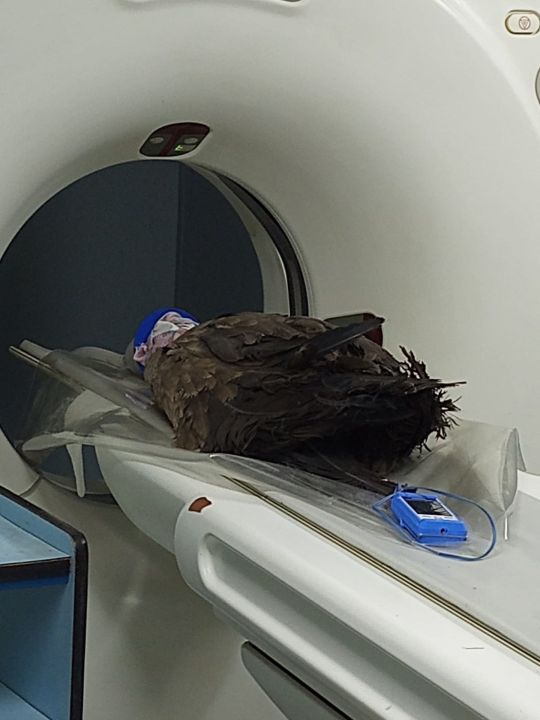 En el transcurso de los días siguientes, los especialistas lograron estabilizarlo y el ave «dejó de caerse para atrás y dar tumbos». Ante la mejora, lo trasladaron a un recinto más grande para ser observado en detalle. «Si bien tuvo una leve mejora, está estancado. Por eso, surgió la posibilidad de hacer una tomografía ya que la radiografía no arrojaba más datos. Queremos saber si hay una lesión de columna, conocer a dónde está y que gravedad tiene para tener un diagnóstico y un pronóstico«, planteó la veterinaria.