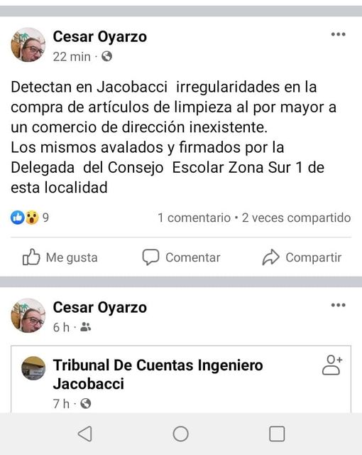 Tanto en su Facebook personal como en el del Tribunal de Cuentas de Jacobacci, Oyarzo público “detectan en Jacobacci irregularidades en la compra de artículos de limpieza al por mayor a un comercio de dirección inexistente. Los mismos avalados y firmados por la Delegada del Consejo Escolar Zona Sur 1 de esta localidad”.