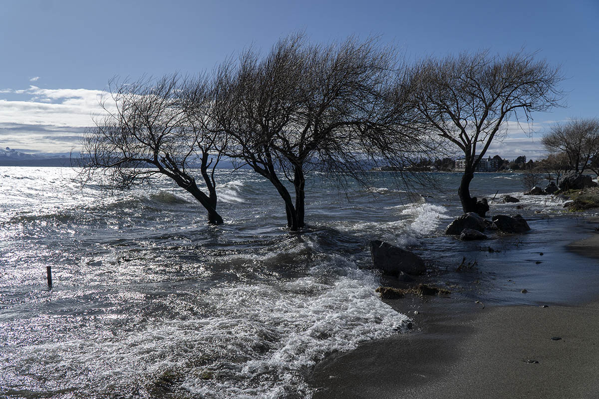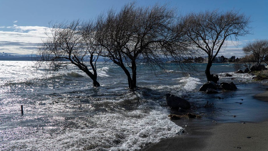 La crecida del lago Nahuel Huapi sorprende a quienes caminan por la costanera. Árboles inmersos en el lago, un muelle completamente tapado por el agua y una costa invadida por el agua.