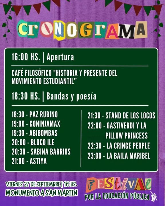 En cuanto a los motivos que impulsan el festival, expusieron en un comunicado: «Los ataques del gobierno nacional de Javier Milei no han cesado: ahora anuncian el veto a la ley de financiamiento universitario, del mismo modo que vetaron el mísero aumento a los jubilados, y un irrisorio presupuesto anunciado para 2025. Por esto urge continuar con el plan de lucha».
