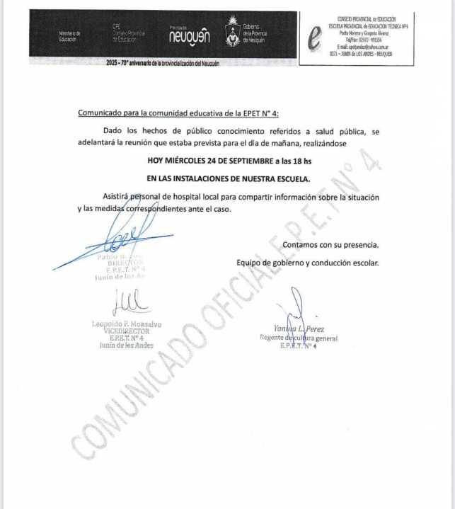 El encuentro será hoy a las 18 en las instalaciones de la escuela. En la nota señalaron que concurrirá «personal del hospital local para compartir información sobre la situación y las medidas correspondientes ante el caso».