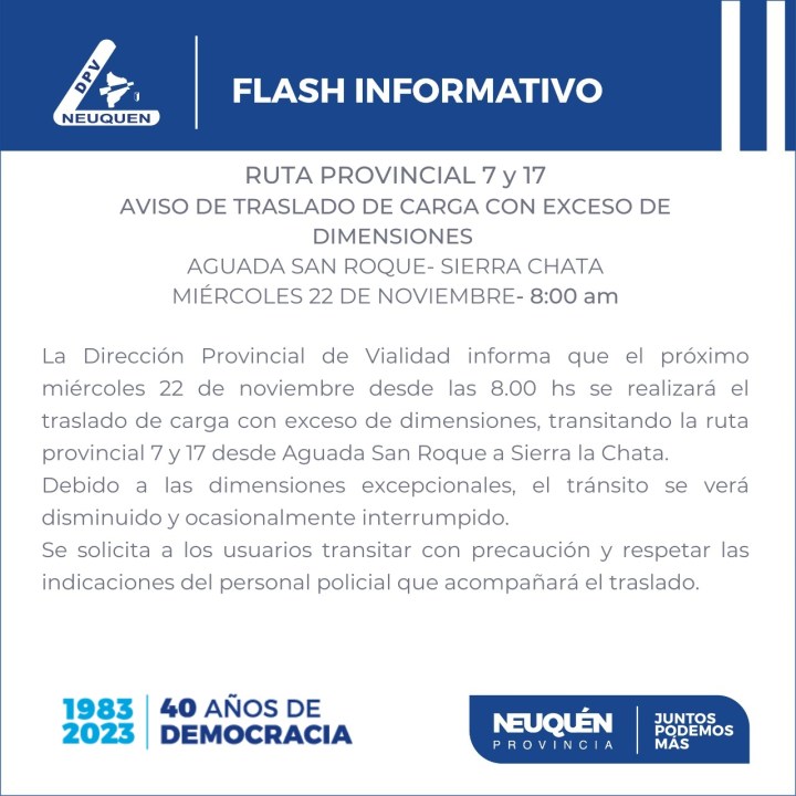 El organismo detalló que será a partir de las ocho de la mañana desde Aguada San Roque hasta Sierra Chata en Vaca Muerta. Por esto, indicaron que «el tránsito se verá disminuido y ocasionalmente interrumpido».