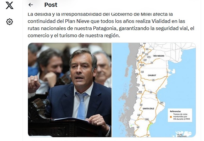 El diputado nacional Martín Soria fue uno de los que mostró preocupación por la situación y utilizó su cuenta de X para indicar que «la desidia y la irresponsabilidad del Gobierno de Milei afecta la continuidad del Plan Nieve que todos los años realiza Vialidad en las rutas nacionales de nuestra Patagonia, garantizando la seguridad vial, el comercio y el turismo de nuestra región».
