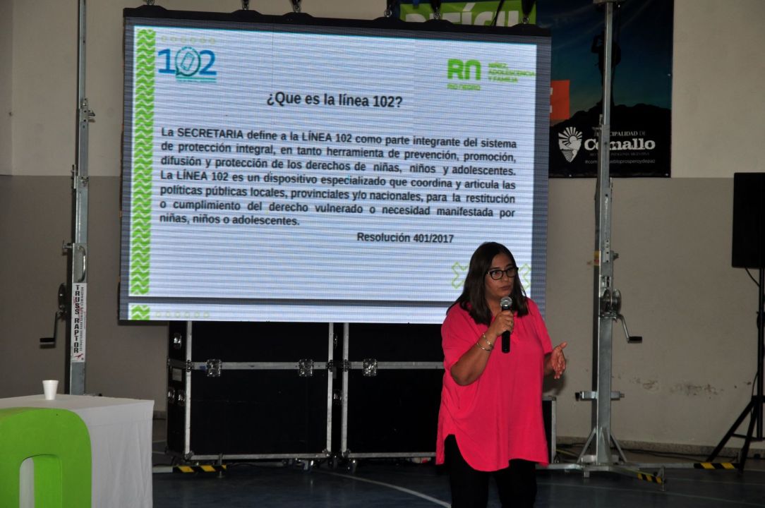 Antes del cierre del encuentro, la secretaria de Estado de Niñez y Adolescencia, Roxana Méndez, brindó información sobre la puesta en marcha de la línea 2920550102, destinada a consultas de niños, niñas y adolescentes.