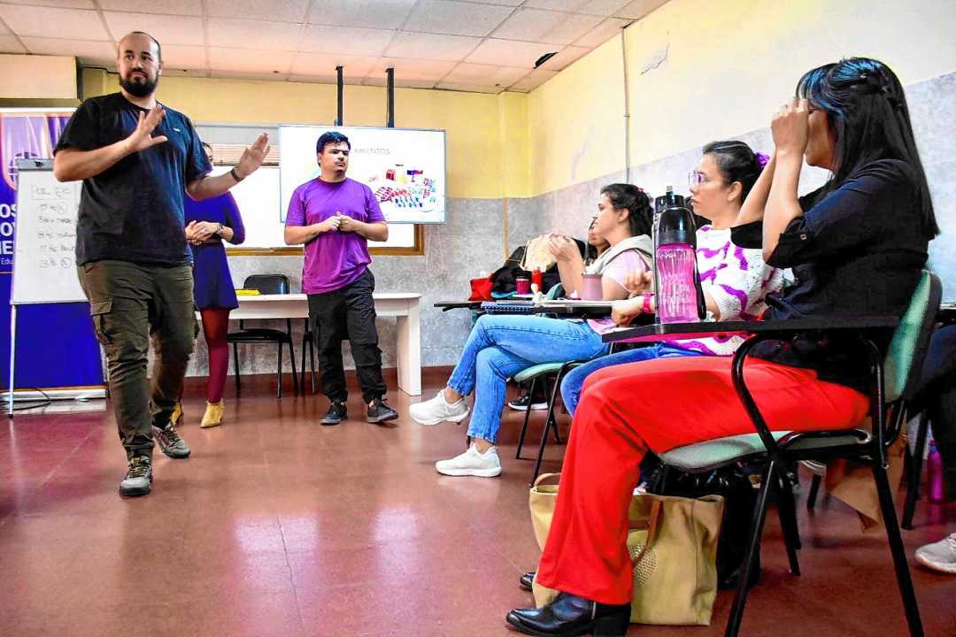 Todos los martes a las 17 en el tercer piso del edificio emblemático de calle Buenos Aires de la ciudad de Neuquén, se reúnen 41 profesionales ( porque la capacidad del aula no da para más) para participar de la capacitación a cargo de Sebastián Caseres, Luis Cano y Tamara Ávila, miembros de la comundiad sorda.