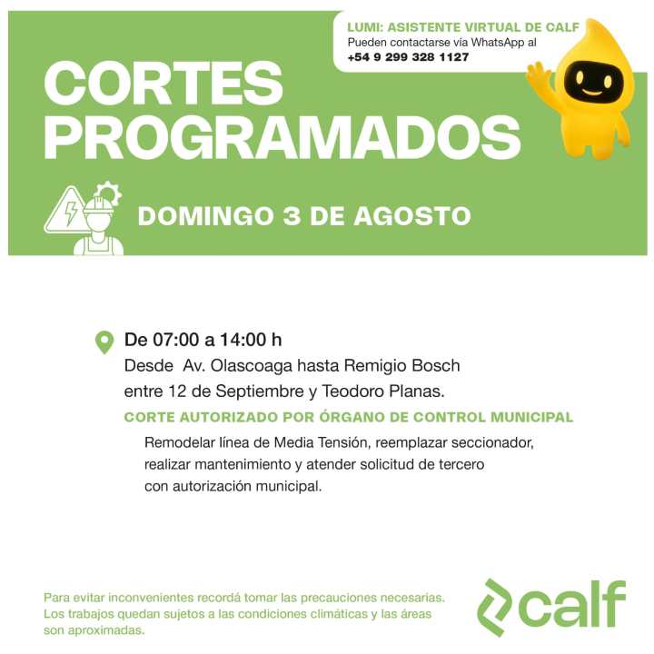 La Cooperativa de Agua, Luz y Fuerza de Neuquén (CALF) informó que realizará trabajos de mantenimiento que implicarán un corte en el suministro eléctrico en la zona cercana a la Ruta 22, el próximo domingo 3 de agosto.