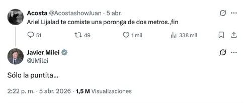 A lo largo del raid, insultó a periodistas como Laura Di Marco, a quien tildó de «operadora roñosa», pero el que más repercutió fue un comentario sobre Ariel Lijald. «Te comiste una p…… de dos metros. fin», dijo un usuario en redes, a lo que el presidente le agregó: «Sólo la puntita».