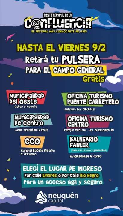 El sábado que viene, 10 de febrero, comienza la Fiesta de la Confluencia 2024 que se extenderá hasta el martes 13. Para ingresar al predio, algunos asistentes necesitarán pulseras que desde el lunes los vecinos ya empezaron a retirar desde el lunes.