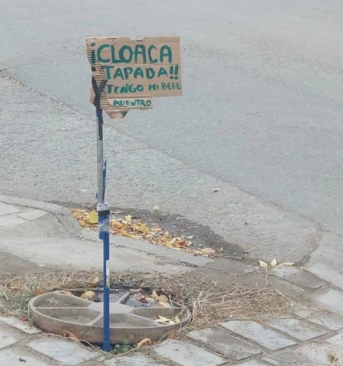 Puso un cartel en la tapa de cloaca como reclamo por los desbordes en su casa de Cipolletti