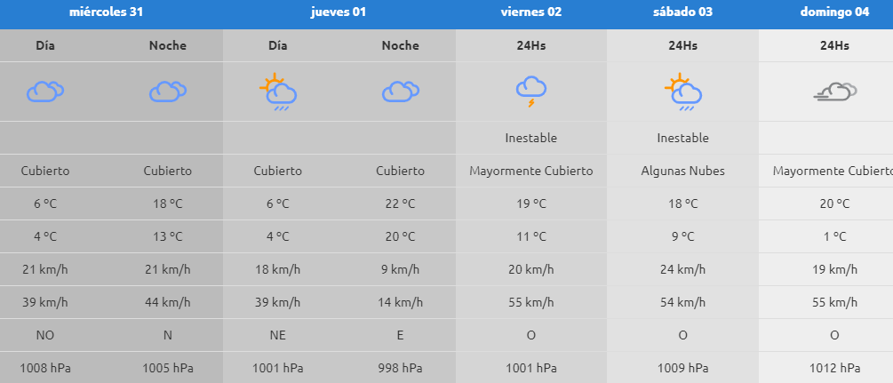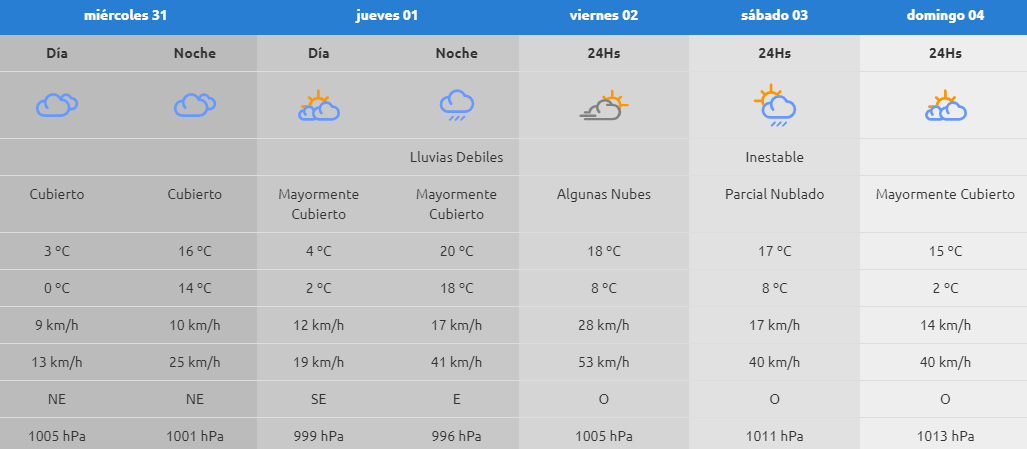 Varían el viento y las precipitaciones que serán mayores. El cielo estará mayormente cubierto y habrá lluvias débiles. Con ráfagas de 41 kilómetros por hora.