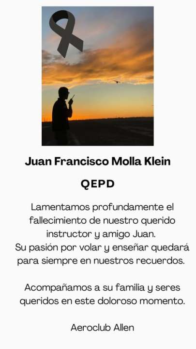 Desde el Aeroclub de Allen compartieron esta madrugada un mensaje de despedida para el joven Juan Francisco Molla Klein que perdió la vida en un accidente que aún se intenta esclarecer. «Su pasión por volar y enseñar quedará para siempre en nuestros recuerdos», aseguraron.