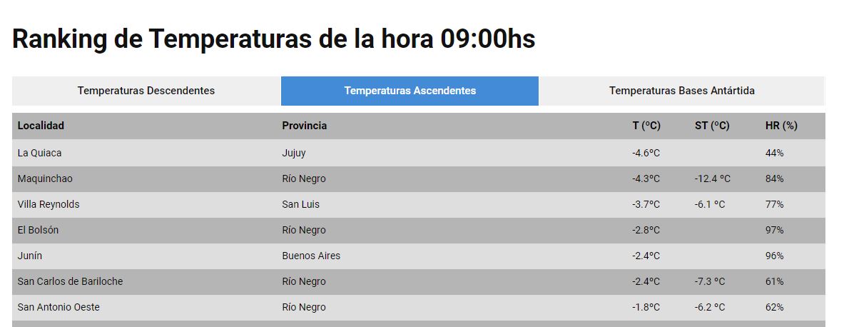 Como se ve en el gráfico, si bien La Quiaca encabeza el listado con – 4.6°, Maquinchao la supera ampliamente porque si bien su temperatura es de – 4.6°, la térmica llega a 12.4°.