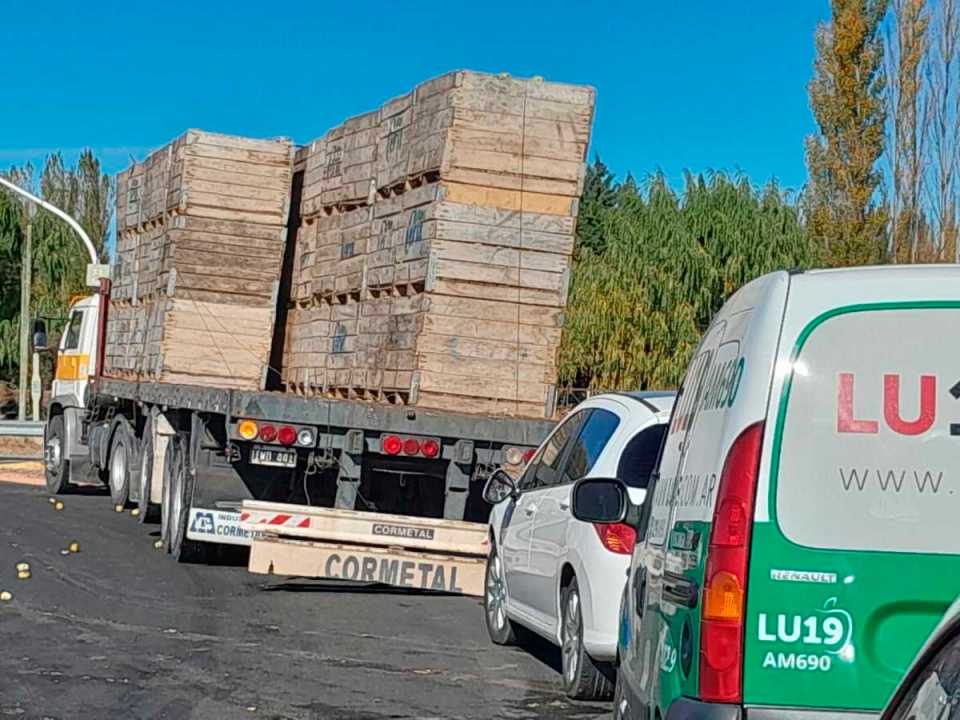 Un camionero realizó una mala maniobra y volcó varios bines de manzana sobre la Ruta 151. El hecho se registró en la rotonda, a la altura del Tercer Puente de Cipolletti. A partir del siniestro, automovilistas interrumpieron el tránsito para bajarse a juntar la fruta.