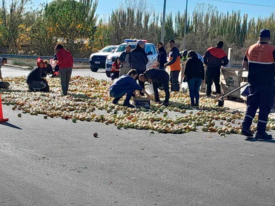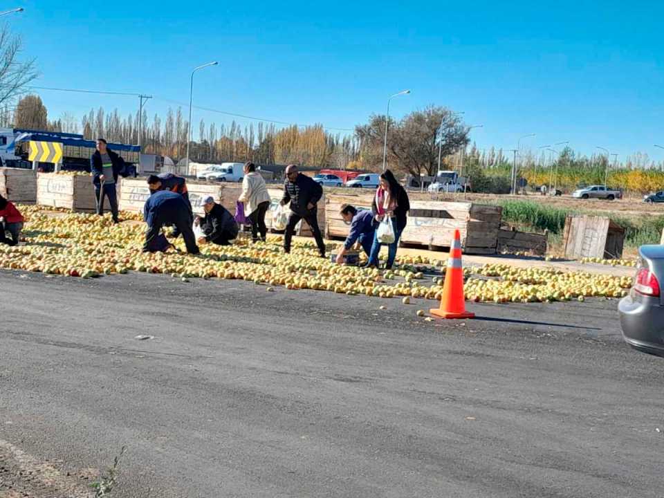 Sin embargo, no solo se le cayeron varios bines manzanas del camión en la rotonda de la Ruta 151 a la altura Tercer Puente de Cipolletti, sino que varios automovilistas que transitaban por el lugar aprovecharon esta ocasión para bajarse de sus vehículos y recuperar parte de la fruta desparramada por el asfalto.