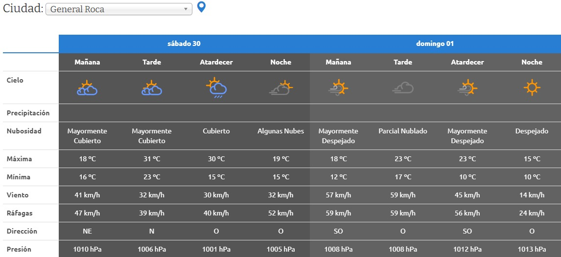 En Roca, el domingo amaneció con temperaturas de 12°C y se espera una máxima de 23°C. El viento alcanzará ráfagas de hasta 59 km/h y el cielo irá de mayormente despejado a parcialmente nublado.