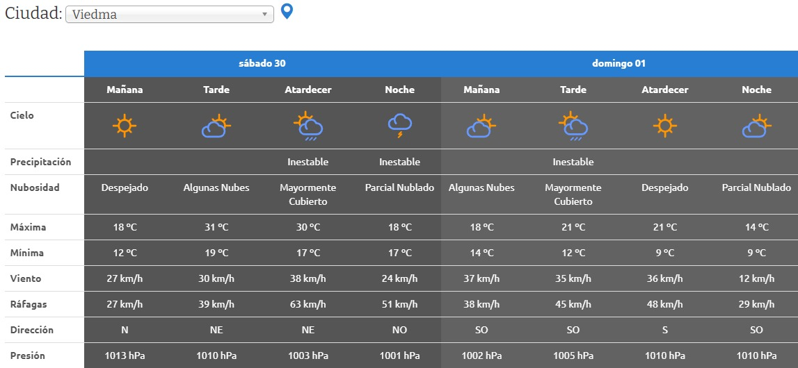 En Viedma, el domingo amaneció con temperaturas de 14°C y una máxima de 21°C. El viento será protagonista, con ráfagas de hasta 48 km/h.