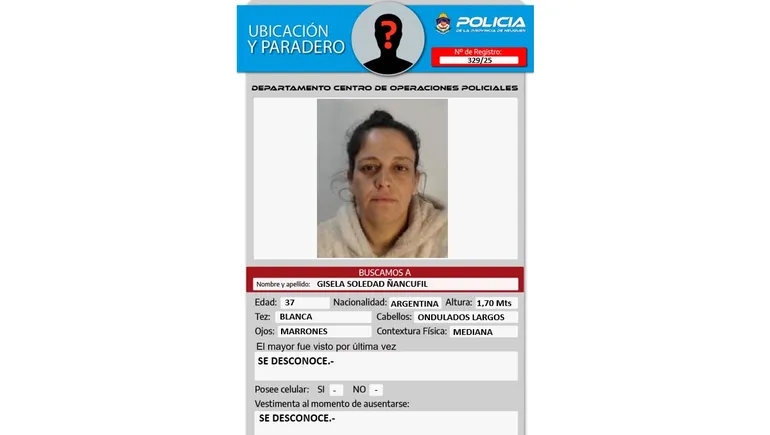 Además de Azul Mía Semeñenko, hasta este jueves por la tarde había otra mujer desaparecida en Neuquén: Gisela Soledad Ñancufil, de 37.