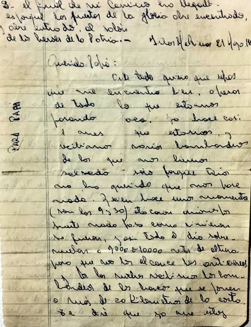 La carta escrita de puño y letra describe con crudeza las crónicas de guerra: aviones que sobrevuelan fuera del alcance de las antiaéreas, bombardeos nocturnos desde el mar y la incertidumbre constante.