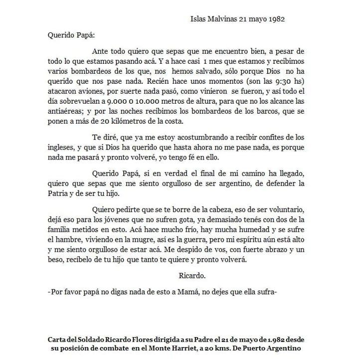 “Querido Papá. Ante todo quiero que sepas que me encuentro bien, a pesar de todo lo que estamos pasando acá”. Así comienza el texto que escribió el 21 de mayo de 1982, desde su posición de combate en el Monte Harriet, a 20 kilómetros de Puerto Argentino. Era un joven soldado a la intemperie, con frío, hambre y entre bombardeos. Era un hijo que intentaba proteger a su familia incluso en el peor escenario.