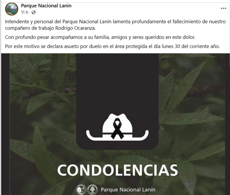 «Intendente y personal del Parque Nacional Lanín lamenta profundamente el fallecimiento de nuestro compañero de trabajo Rodrigo Ocaranza. Con profundo pesar acompañamos a su familia, amigos y seres queridos en este dolor», expresaron y tras esto comunicaron que durante este lunes 30 habrá asueto por duelo en el área protegida de Neuquén.