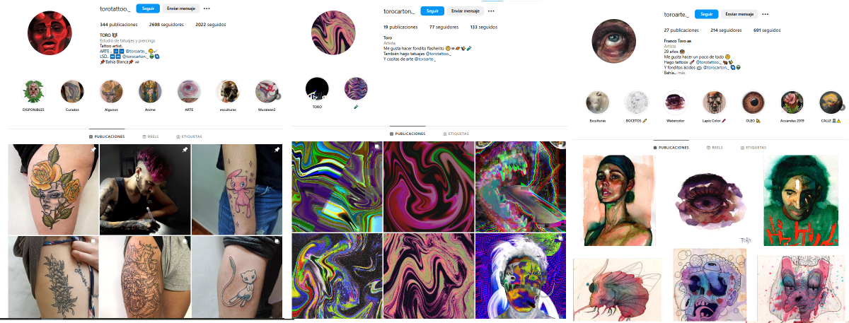 El joven bahiense cuenta con al menos tres perfiles en Instagram cada uno responde a sus distintas facetas artísticas: mientras en uno comparte su trabajo como tatuador, en otro promueve su trabajo como pintor y escultor, y en el último exhibe sus obras sobre acuarela, óleo, lápiz y otros materiales.