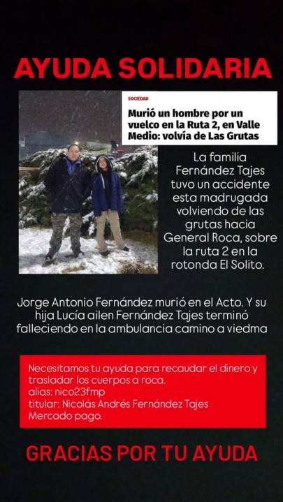 Mientras tanto, familiares de las víctimas fatales organizaron una campaña en redes sociales para juntar fondos para trasladar sus cuerpos hacia el Alto Valle.