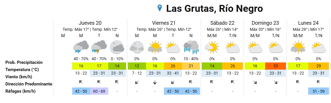 En la costa rionegrina, el viernes se esperan chaparrones durante la noche. Para Las Grutas, hay pronosticado ráfagas de hasta 50 km/h. El fin de semana disminuirá el viento y estará algo nublado. Las temperaturas máximas serán de 26ºC el sábado y de 33ºC el domingo.