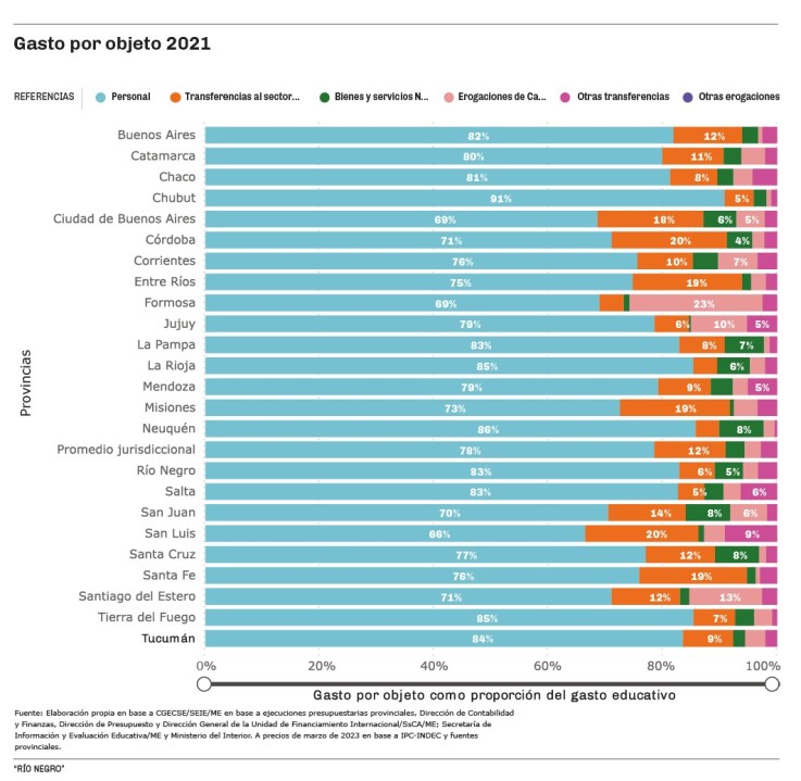 A nivel jurisdiccional, si bien todas dedican más del 65% de sus presupuestos educativos al pago de personal, existen diferencias entre ellas. Y allí aparece que entre las que dedican la proporción más alta al personal están Chubut (91%) y Neuquén (86%). En el otro extremo, las que menos le dedican a este objeto son: San Luis (66%), Formosa y CABA (69%).