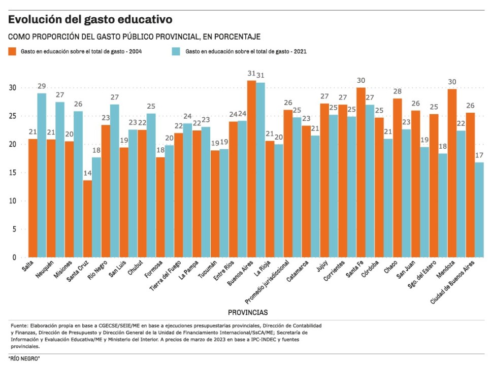 En el mismo período, Salta (+8,1 pp) y Neuquén (+6,6 pp) fueron las que más incrementaron su esfuerzo presupuestario, al aumentar la proporción de su presupuesto destinado a educación.