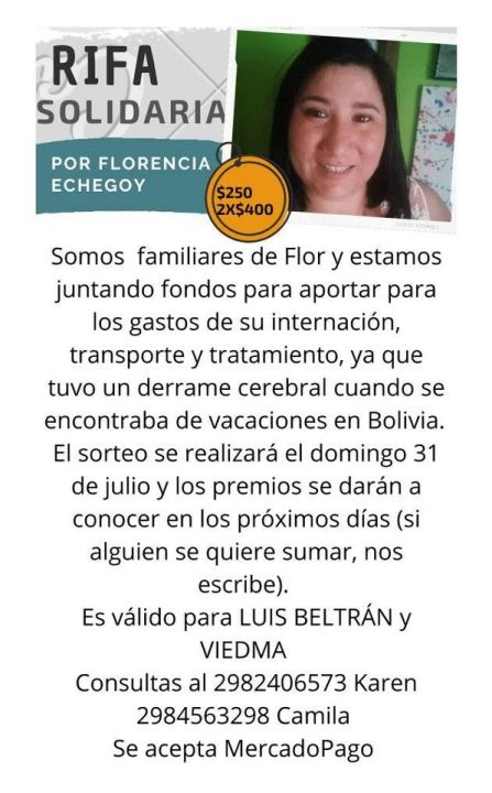 Vecinos de Viedma lanzaron una campaña solidaria para colaborar con la familia de Florencia Echegoy, una joven de la ciudad que estaba de vacaciones en Bolivia y sufrió un derrame cerebral. La mujer debió ser intervenida quirúrgicamente en aquel país y luego fue trasladada a la Argentina. Ahora se encuentra en terapia intensiva en Salta.