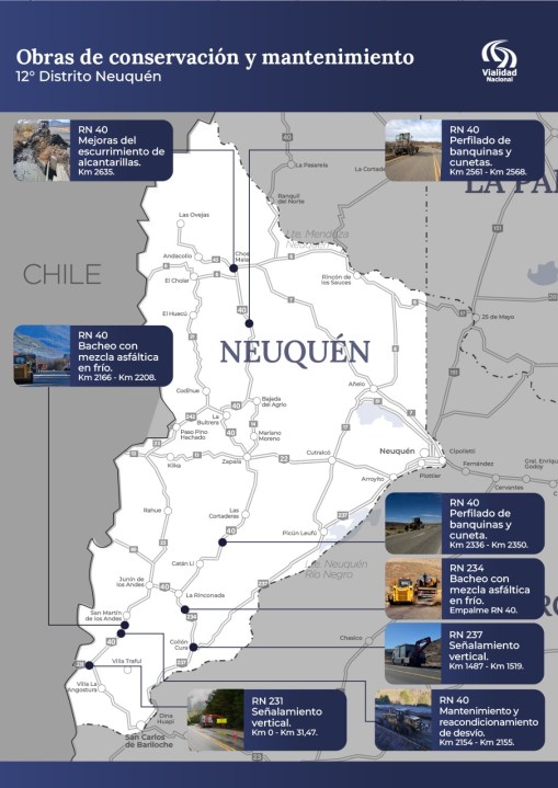 En rutas de Neuquén se hicieron tareas de conservación y mantenimiento. Así lo indicaron desde Vialidad Nacional. Entre ellas, se mencionó trabajos en la Ruta 40, Ruta 231, Ruta 234 y Ruta 237. «Ejecutados por personal del organismo, con recursos y maquinaria propia, distribuidos estratégicamente en los diferentes campamentos del distrito neuquino», informó el organismo.