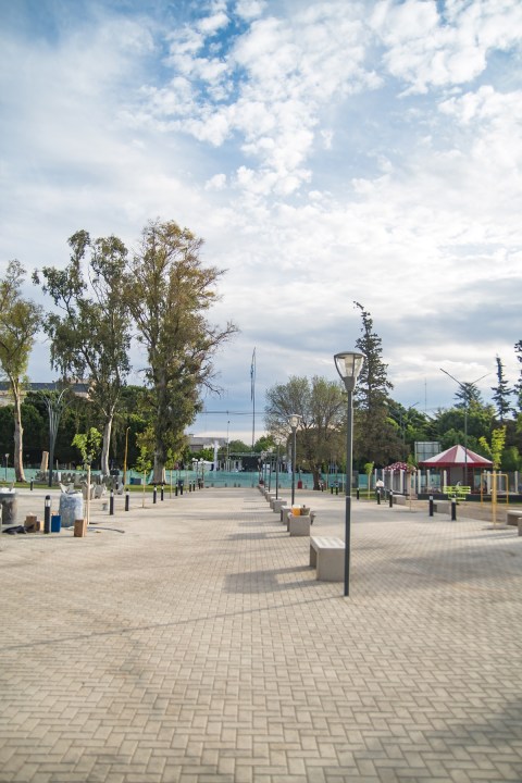 En la intervención lo que se buscó fue unir los espacios desconectados, a través de la unificación de los niveles de solado. Se propuso un nuevo diseño y recambio de equipamiento urbano, para crear un gran espacio conectado que combina zona de juegos infantiles, sendas peatonales, acceso al antiguo edificio ferroviario, y actual Concejo Deliberante, áreas verdes, un gran playón recreativo equipado con mobiliario urbano, esculturas y un monumento homenaje a los Primeros Pobladores.
